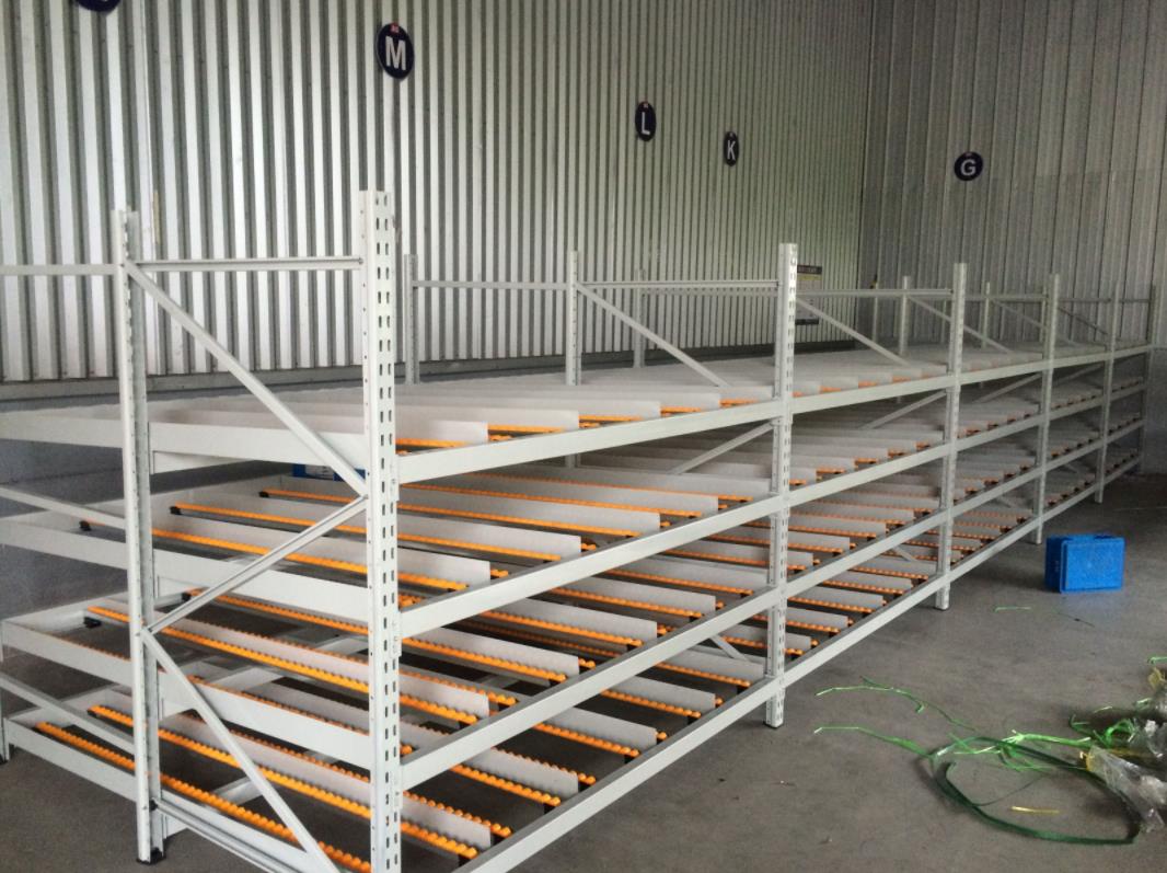 滑移式復(fù)合管貨架上面裝有滑軌,依靠滑軌的滑動性和傾斜度以及物料自身的重力,可以實(shí)現(xiàn)物料自動滑動,從有坡度的滑道上端將貨物置于滾輪上,貨物借助重力作用自動下滑,利用一邊通道存貨,另一邊通道取貨??蓪?shí)現(xiàn)先進(jìn)先出,一次補(bǔ)貨多次揀貨。