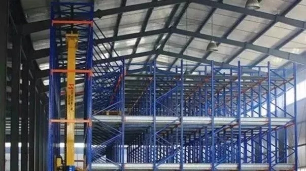 叉車裝載托盤駛入托盤貨架存儲位置。